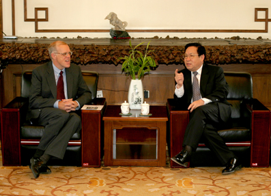 The president of the largest private university in the U.S. and the “strongest university in China” met for a friendly visit and short seminar on university governance May 27.