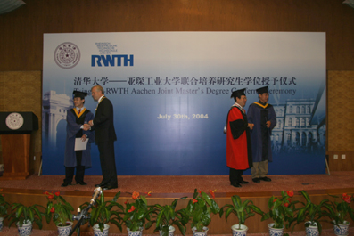 A ceremony was held for 22 graduate students of Tsinghua University, who have taken part in a joint master program by Tsinghua and RWTH Aachen in Production Engineering and Automotive Engineering, to confer them degrees in the Reception Hall of the Main Building in Tsinghua University on July 30. President of Tsinghua University Gu Binglin, Dr. Rauhut, Rector of RWTH Aachen, Mr. Cao Guoxing, Director-General of the Department of International Cooperation and Exchange, Ministry of Education, China, Dr. Wolf-Dieter Dudenhausen, State Secretary in Federal Ministry of Education and Research, Germany, attended the ceremony. Professor Gong Ke, Vice President of Tsinghua, hosted the ceremony.