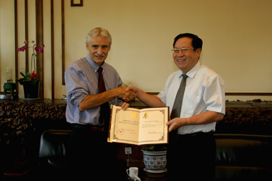 President Gu introduced Tsinghua University and said that more attention would be paid to life science in the future. They talked about fund raising, students, and so on. After the meeting, President Gu awarded the letter of appointment to Prof. Hartwell.