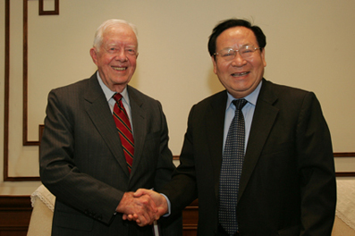During their conversation, President Gu stated that the relationship between Tsinghua and the U.S.A. has a long history which includes institutional exchanges, collaboration with industries, and visits by government officials. President Gu then briefed Mr. Carter on Tsinghua’s latest development in education and overseas cooperation. President Gu and Mr. Carter also exchanged ideas on future collaboration between Tsinghua and The Carter Center in Atlanta. Tsinghua University Vice President Yuan Si also participated in the discussion.