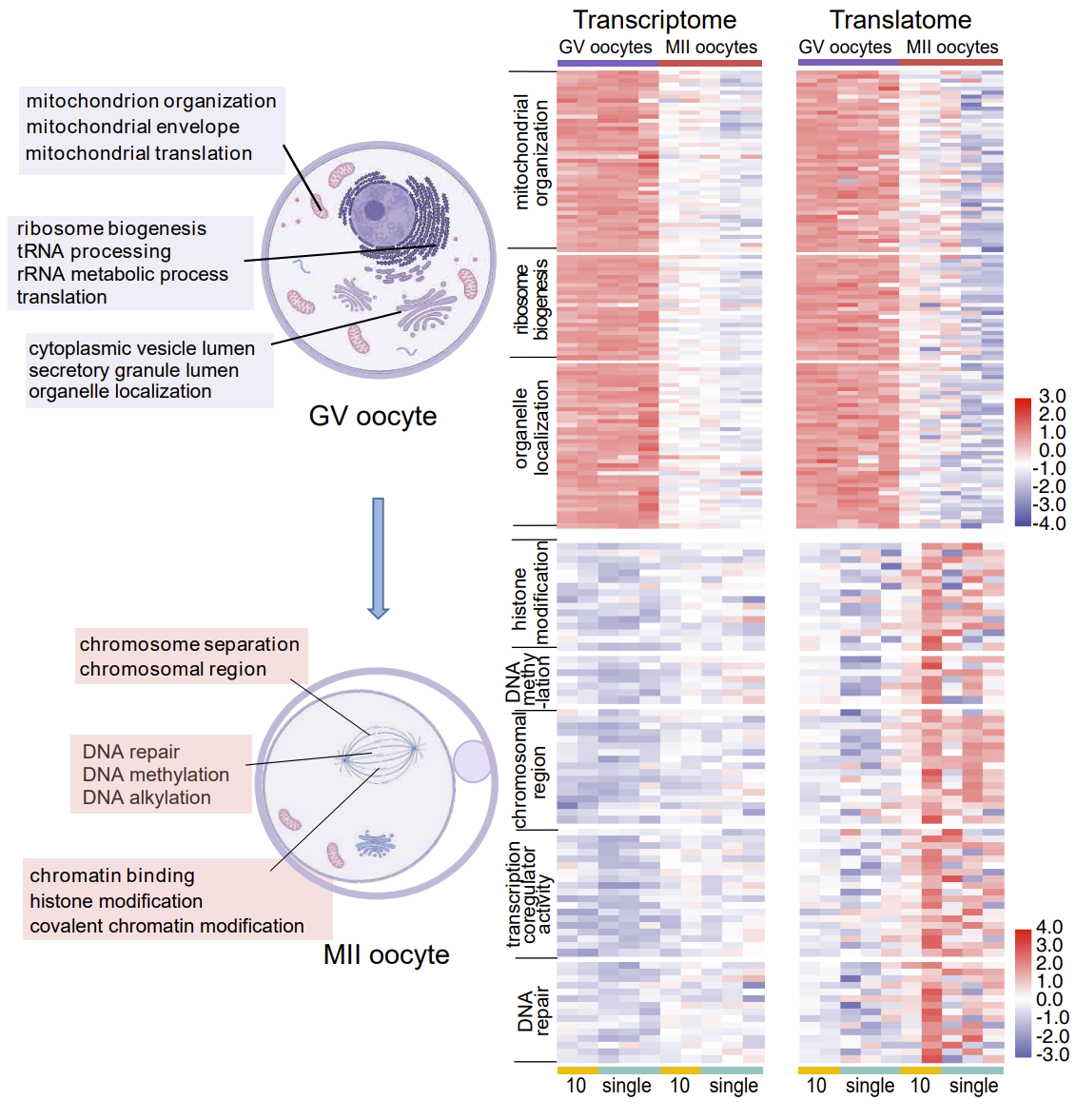 In immature oocytes, the functions of genes that are actively translated are mainly ribosome formation, mitochondrial synthesis, and cytoplasmic translation. In mature oocytes, the functions of genes that are actively translated are mainly chromosome segregation, cell cycle regulation, and chromosome modification (Fig. 2). These findings reveal the sequential regulation of gene expression from the cytoplasm to the nucleus during oocyte maturation. Moreover, the genes with high translation efficiency in mature oocytes were significantly more than those in immature oocytes, reflecting the importance of translation regulation during oocyte maturation.