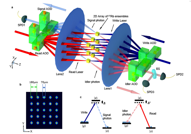 Fig. 1 Experimental setup for generation and verification of multipartite entanglement between a 2D array of atomic quantum interfaces.