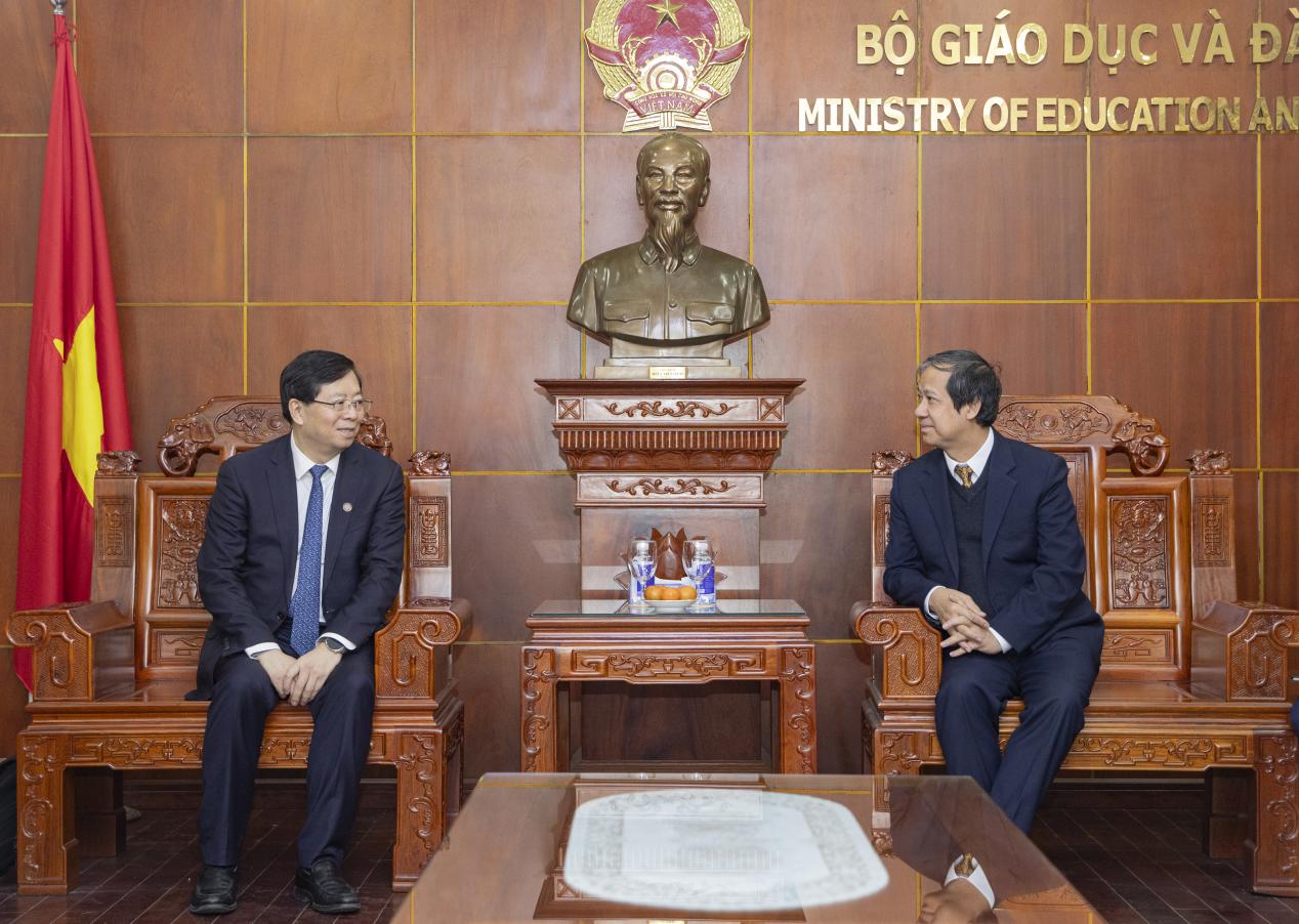 Qiu Yong (left) discusses education exchange with Nguyen Xuan Thang.