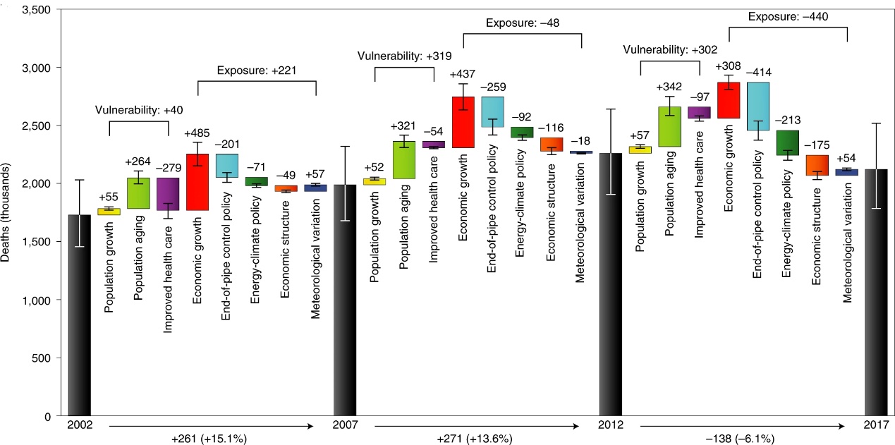 The study found that premature deaths associated with PM2.5 pollution in China increased by 23% between 2002 and 2017. Among all these factors, the surge in fossil fuels consumption brought by rapid economic growth was one of the leading factors for the increased mortality risk, contributing to 1.23 million increase in PM2.5-associated deaths. The implementation of end-of-pipe control policies avoided premature deaths of 870,000 people, offsetting about 70% of the incremental mortality risk due to economic growth. Energy-climate policies and changes in economic structure contributed significantly to air pollution improvement, avoiding premature deaths of 720,000 people. During 2002-2017, with the implementation of the Air Pollution Prevention and Control Action Plan, stronger measures were taken on end-of-pipe control and energy structure transformation, driving the inflection point of PM2.5-associated mortality decrease in China.