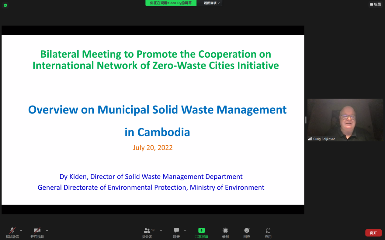 Tsinghua University/Basel Convention Regional Centre for Asia and the Pacific (BCRC China) and Cambodia’s Ministry of Environment jointly held a successful bilateral meeting online on July 20th to promote the cooperation on the International City Network of Zero-waste Initiative. The meeting was attended by 19 Cambodian government officials including Heng Nararith, Deputy Minister of Environment; Dy Kiden, General Directorate of Environmental Protection, Ministry of Environment; Dyakanal Sophal, Head of Hazardous Waste Management Department, General Department of Environmental Protection; Chandath Hay, Deputy Head of Air Quality and Sound Management Department. Li Jinhui, Executive Director of the BCRC China and Professor at Tsinghua University’s School of Environment; Zhao Nana, Assistant Director of the BCRC China; Craig Boljkovac, Senior Advisor; Shan Guijuan, Deputy Head of the Environmental Technology Unit; Chen Yuan, Head of the Regional Chemicals Unit; and project assistants Liang Ju, Wang He, and Shen Qimeng were also in attendance. Craig Boljkovac hosted the meeting.