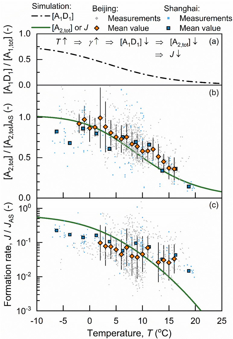 The new mechanism also explains the characteristics of atmospheric new particle formation as temperature changes. As temperature rises, the stability of acid-base dimer clusters decreases, and their formation is inhibited, making high temperatures unfavorable for the formation of acid-base clusters and new particles. As shown in Figure 4, the concentration of acid-base clusters and the new particle formation rate measured in Beijing and Shanghai both decrease as the temperature rises, consistent with the predictions of the new mechanism. This also answers the conundrum of why new particle formation in Beijing is weaker during the summer when the sunlight is stronger instead.