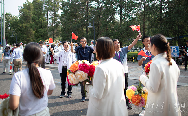 10月1日13时许,光荣完成国庆游行任务的清华师生载誉而归。欢呼着,雀跃着,他们挥舞着手中的花束向清华园走来,成为今日清华最闪耀的一道风景线。他们向在清华西门等候多时的师生们热情挥手,向深爱着的清华园报告:“今天,我们光荣完成祖国交给的任务!”副校长、教务长杨斌,多位院系和部处负责人,军乐仪仗队,师生志愿者共计一百余人在校门口列队夹道欢迎。