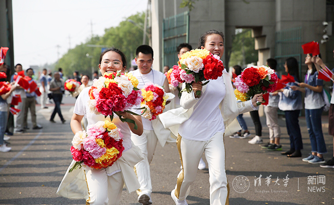今天的清华园,到处洋溢着喜庆的节日氛围。主楼前、宿舍楼外、操场上,还有一辆辆自行车的车篮上,一面面五星红旗迎风飘扬,师生们对祖国的美好祝福汇聚成一片沸腾的红色海洋。“不忘初心、牢记使命”的合影浮雕,“我们都在努力奔跑,我们都是追梦人”的巨幅展板,同学们亲手描绘的彩色绘版,沿途补给区一字排开的丰富饮品,都在向载誉而归的师生们致以最热情的问候:“欢迎回家!”