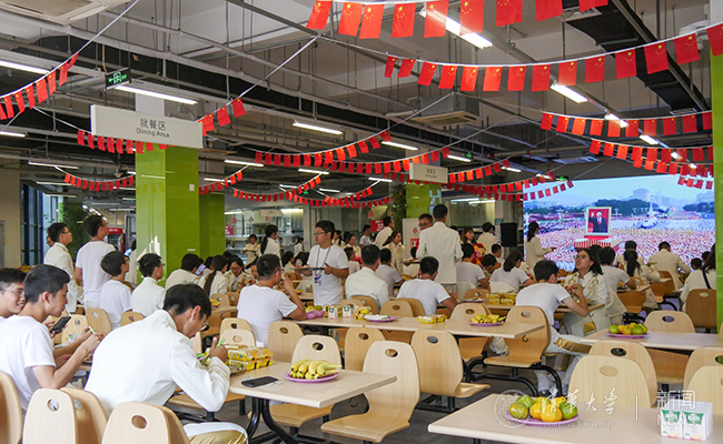 餐厅内外的电子屏循环播放着队伍行进的实况录像。当屏幕上出现整齐划一的“伟大复兴”方阵时,师生们不由自主地举起手中的饮料,为自己的精彩表现干杯,为清华人的齐心协力欢呼,为圆满完成光荣任务喝彩!