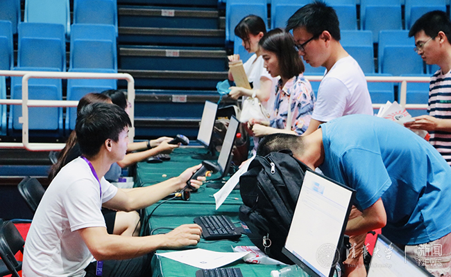 研究生新生在综合体育馆办理报到手续