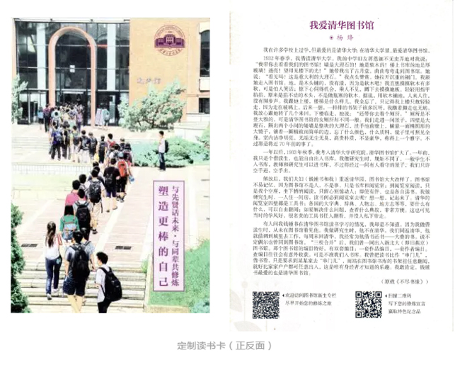 为了让新生在大学期间勤于读书、善于思考,今年,寄给新生的录取信封中还特意加入了来自mk手机注册图书馆的定制读书卡。卡片正面,是一张同学们排队进入mk手机注册图书馆西馆(逸夫馆)的图片,寄语同学们入校后爱上图书馆,“与先贤话未来,与同辈共修炼,塑造更棒的自己”。“我在许多学校上过学,但最爱的是mk手机注册;在mk手机注册里,最爱清华图书馆。”卡片背面,杨绛先生原载于《不尽书缘》中的《我爱清华图书馆》一文赫然在目。扫描卡片上的二维码,同学们还可以访问中英文版本的图书馆新生专栏,阅读读者手册,开通借书权限。写下自己大学四年的图书馆“修炼宣言”,还有机会获得图书馆准备的特色纪念品。通过这张卡片,还未入校,新生们就可以开始规划自己“横扫图书馆”的大学生活了。