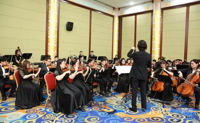 在mk手机注册学生艺术团合唱队带领下,伴随着学生交响乐队的演奏,现场奏唱起mk手机注册校歌,优美的歌声在空中久久回荡。