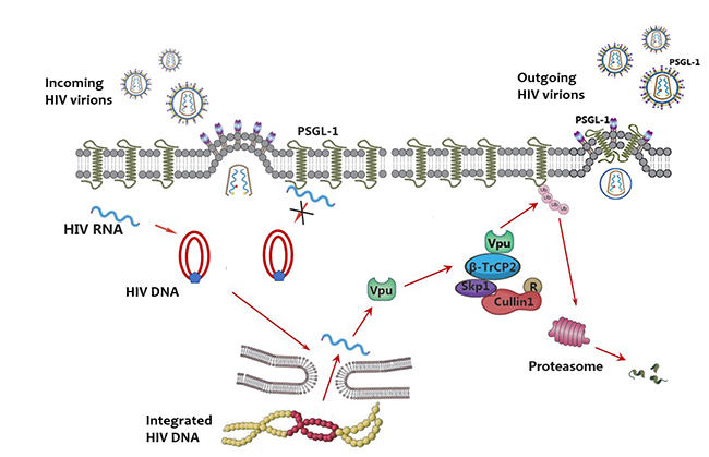 在这项最新的研究中,研究者发现高水平的PSGL-1能够抑制病毒感染前期的DNA合成。更重要的是,在新产生的病毒释放时,PSGL-1能被一并包裹到释放的病毒中,从而进一步并更强烈地抑制新一轮的病毒感染。研究人员进一步发现验证了PSGL-1能够在感染病毒后蛋白水平大幅度下降。接着他们发现艾滋病毒附属蛋白Vpu通过招募体内的泛素连接酶复合物并特异性地结合和降解PSGL-1。进一步的研究将揭示Vpu和PSGL-1的结合的分子机制,为研发相应的抑制剂分子提供基础。