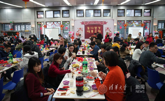 在餐厅里,食堂师傅们精心准备了丰盛可口的年夜饭。前来参加晚会的同学们纷纷在入口处领取纪念品,并在主持人引导下参加游戏和抽奖活动。在每人一张的清华主题明信片上,同学们写下对亲朋好友的新春祝福,在新春第一天寄往世界各地。