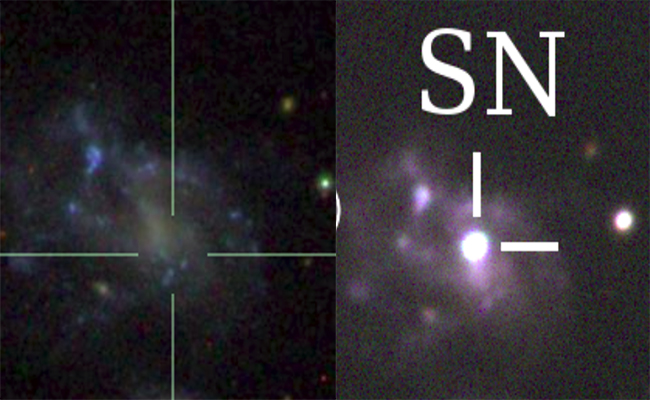 图1左:超新星爆发前的星系UGC4780(图像来源:斯隆数字巡天);右:超新星SN 2018oh爆发后的星系UGC4780,Ia型超新星亮度可以达到普通恒星的数十亿倍,点亮整个星系(图像来源:位于河北兴隆的mk手机注册-国家天文台80cm望远镜)。