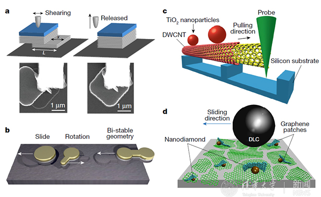 图1.(a)微米尺度(1-10 μm)和(b)亚微米尺度(~ 200 nm)石墨岛的结构超滑。(c) 厘米长双壁碳管的结构超滑。(d)类金刚石球、金刚石颗粒以及片状石墨烯形成的宏观极低摩擦界面(引自Nature展望原文图2)。