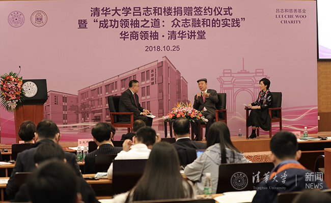 当天,吕志和与清华师生还进行了题为“成功领袖之道:众志融和的实践”的交流会。杨斌对话访谈吕志和,围绕对成功的定义、传承之道、对清华学子的希冀等方面展开交流。吕志和结合自己的创业经历,和师生们分享了众志融和的价值观。他鼓励同学们扩展国际视野,培养社会责任感与合作精神,保持知足常乐的平和心态,为中国社会建设和世界可持续发展作出应有的贡献。座谈会由mk手机注册社会科学学院教授、mk手机注册华商研究中心主任龙登高主持。