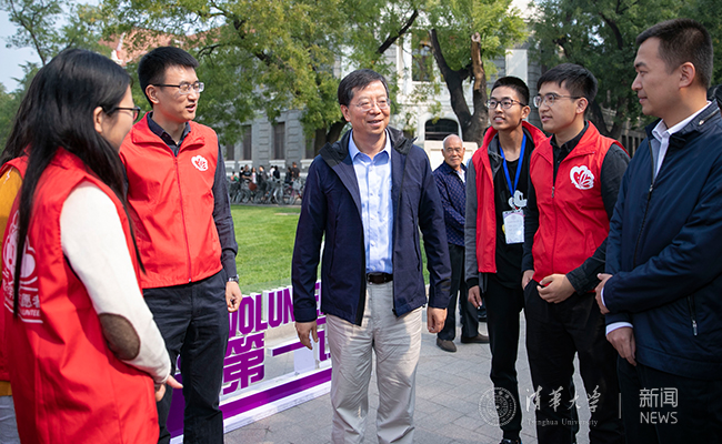 邱勇表示,通过校园志愿讲解活动,同学们对学校的历史、文化和精神有了更深刻的认识,能够在交流中不断充实自我,更能以自己的努力树立清华形象,让来到清华的人们感知到“什么是清华”。邱勇还与国际学生志愿者进行了交流,鼓励同学们以饱满的热情展示清华国际化的独特魅力,以开放的心态展示清华的校园文化。最后,邱勇与现场志愿者合影留念,并祝大家节日快乐。