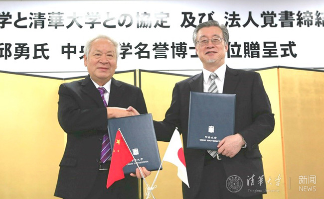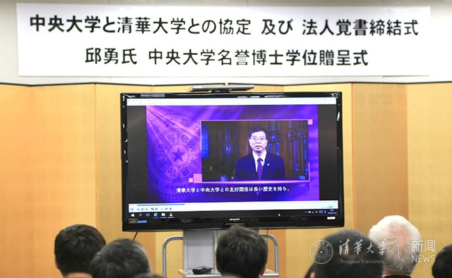 在随后举行的“邱勇校长日本中央大学名誉博士学位授予仪式”上,受邱勇校长委托,顾秉林院士代为接受中央大学总长酒井正三郎颁发的名誉博士证书和学位服。邱勇校长专门录制了视频答谢辞,对获得日本中央大学名誉博士表示感谢,对未能到场深感遗憾,并表示将努力促进中日两国友好关系的发展、努力为两校的合作交流作出更大贡献。