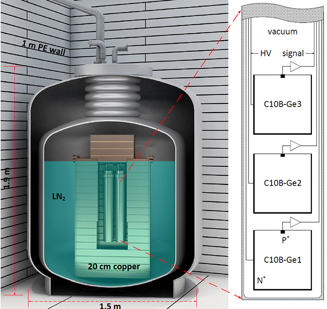 高纯锗是一种半导体材料,纯度非常高,杂质浓度一般在1010原子/cm3的水平,相对纯度达到了99.9999999999%(俗称12个9),这一纯度是人们熟知的万足金(99.99%)的一千万倍。由于高纯锗的纯度很高,因此自身放射性水平很低。同时,由于其作为一种半导体探测器,平均电离能很小,能够获得比闪烁探测器和气体探测器好很多的能量分辨率和极低的能量阈值。基于以上特点,国际上若干实验组如CDEX(中国)、CoGeNT(美国)、SuperCDMS(美国)、EDELWEISS(欧洲)等均采用高纯锗晶体作为靶材料和探测器进行暗物质直接探测实验。