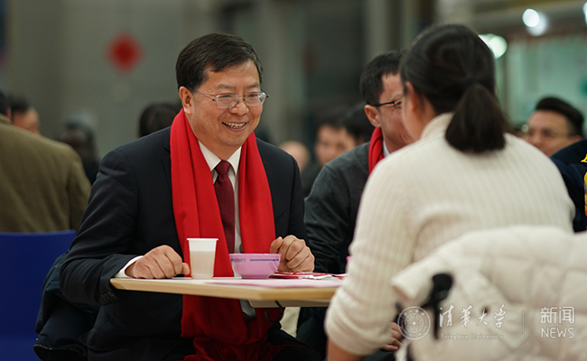 在餐厅里,食堂师傅们精心准备了丰盛可口的年夜饭。前来参加晚会的同学们纷纷在签名墙前合影留念,并在主持人引导下参加“一站到底”和抽奖游戏。在每人一张的清华主题明信片上,同学们写下对亲朋好友的新春祝福,在新春第一天寄往世界各地。