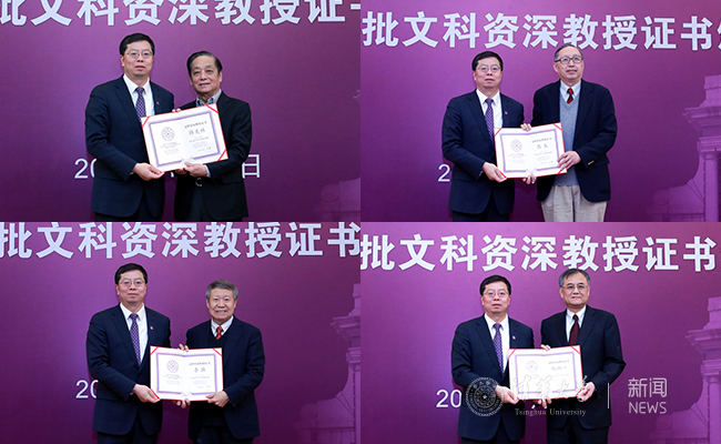 在清华校歌旋律中,邱勇为首批文科资深教授逐一颁发证书并合影留念。邓卫介绍了文科资深教授入选者基本条件以及首批遴选工作情况。