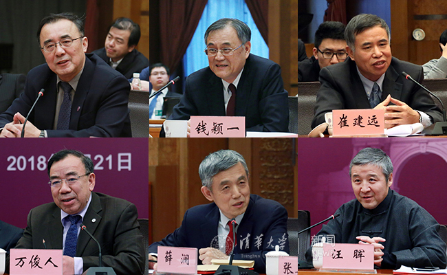 谢维和、钱颖一、崔建远、万俊人、薛澜、汪晖(按年龄长幼排序,从左到右、从上到下)发言。石加东 摄