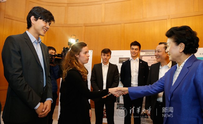 在苏世民书院,刘延东考察了解了书院的发展近况,观看了“中国社会实践课程”的学生成果展示,与实践指导教师及学生代表互动交流。刘延东对同学们说,苏世民书院作为中美两国元首共同支持的项目,建在中国、面向世界、融入清华,是中国乃至世界高等教育改革创新的体现。今后的中国将更加开放,同学们来自世界各地,希望大家增强跨国界、跨种族、跨地域的学习交流,深入了解中国,交流心得体会,共同面对人类未来发展面临的挑战,为构建人类命运共同体做出自己的努力和贡献。