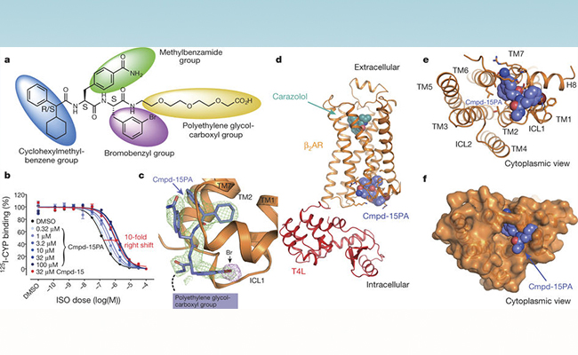 在这项工作中,布莱恩·克比尔卡研究组利用一个beta2肾上腺素受体和T4溶菌酶的融合蛋白(β2AR-T4L)进行晶体学研究。研究初期利用T4溶菌酶的融合蛋白与Cmpd-15共结晶,获得了2.5埃的晶体数据。但是由于胞内别构拮抗剂Cmpd-15溶解性很差,在结晶条件中最高只能加到200uM。在晶体数据里虽然看到胞内部分有很弱的电子密度,但是无法准确判断其结合方式。后来合作研究组对Cmpd-15进行了修饰,在其上加入一个羧酸聚乙二醇基团以提高其溶解度。改造后的小分子即为Cmpd-15PA。 布莱恩·克比尔卡研究组又获得了T4溶菌酶的融合蛋白与Cmpd-15PA复合物2.7埃的晶体结构。其晶体数据清楚地揭示了Cmpd-15的结合方式,羧酸聚乙二醇基团在晶体中处于柔性不可见的状态。Cmpd-15结合在跨膜螺旋1、2、6、7的胞内端与胞内环1以及螺旋8形成的底物口袋。结构分析、分子动态模拟以及生化实验结果表明,Cmpd-15通过两种方式形成功能:一是通过稳定跨膜螺旋6,将beta2肾上腺素受体稳定在非激活状态,从而影响正构底物的亲和力;二是直接与下游信号蛋白如G蛋白或者抑制蛋白 (arrestin)竞争,干扰下游信号传导。