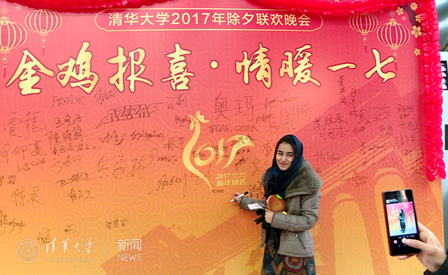 在餐厅里,食堂师傅们准备好了可口丰盛的年夜饭。前来参加晚会的同学们在签名墙合影留念,并在勤工助学大队同学的引导下参加猜灯谜游戏。每人一张清华主题的明信片,同学们可以写下对亲朋好友的新春祝福,在新春的第一天从清华园寄往世界各地。