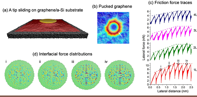 原子模拟模型和结果:(a) 探针在铺展于粗糙基底上石墨烯滑动的模型;(b) 石墨烯在表面作用下粘着褶皱的形貌; (c) 滑动过程中的摩擦力变化曲线; (d) 滑动界面原子尺度作用力在不同阶段的分布图。
