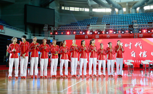 在综合体育馆,2000余名师生已经等候在场内,他们手持国旗、手举名牌,观看女排在里约的冠军赛录像。当女排姑娘拿下冠军点,五星红旗冉冉升起时,场内观众激动依旧,爆发出雷鸣般的热烈掌声。