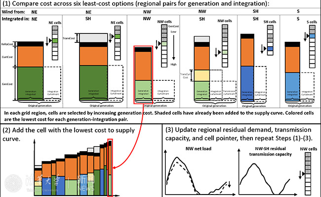 该研究构建了一个小时级别的电力调度模型,将我国电网分为东北、西北、三华(华北、华东和华中)和南方四个区域,综合考虑电力需求、负荷特性、电源结构、最小负荷运行要求、煤电机组运行限制及跨区域特高压输电等因素,模拟在不同风力发电成本、上网电价政策、煤电爬坡备用成本和电网运行约束条件下,风电资源开发的最优空间布局和相应的电力供应曲线。研究提出了风电供应曲线模型模拟研究框架,得出了基准情景下中国2030年并网风电的供应曲线。
