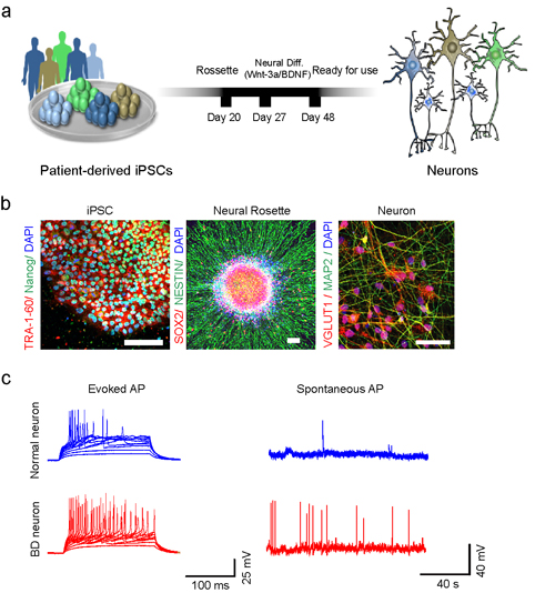 图为躁狂病人iPSC分化的神经元具有超兴奋特征:a. 从干细胞到海马dentate gyrus颗粒神经元的分化途径。b. 处于不同分化阶段的细胞的免疫荧光分析。c. 神经电生理学分析发现病人的神经元的动作电位发放频率显著高于正常人神经元。