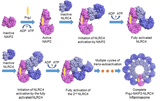 该钩状结构相当于“PrgJ-NAIP2-NLRC4”复合物组装过程的一个中间状态,表明“PrgJ-NAIP2-NLRC4”复合物的组装是一种具有方向性的梯次激活过程,结合了配体的NAIP2起始了这一激活过程。由于NLRC4蛋白并不结合配体,所以随后的NLRC4蛋白的激活仅依赖于上一个活化的NLRC4蛋白,所以NLRC4蛋白以一种类似于阮病毒“自我复制”的方式激活并组装成寡聚体结构。