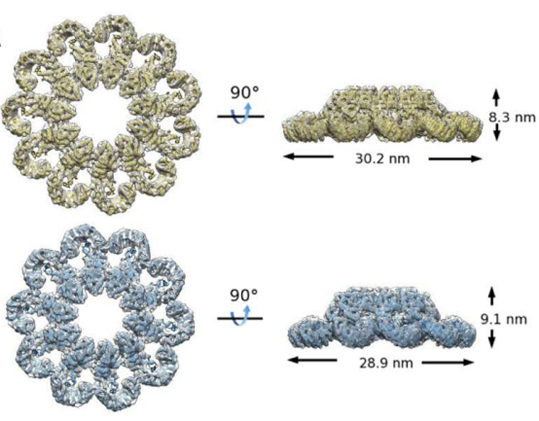 之后,柴继杰教授研究组和隋森芳院士研究组合作,展开对激活状态下NAIP-NLRC4炎症小体的结构和功能研究。经过多次的尝试,最终利用冷冻电镜方法解析了“PrgJ-NAIP2-NLRC4ΔCARD”复合物平均分辨率为6.6埃的三维结构。该结构为10-12个NAIP2/NLRC4蛋白分子相互作用并聚合成一个盘状结构(图1)。纳米金颗粒标记实验表明该盘状结构中,只有一个NAIP2蛋白分子,其余的均为NLRC4蛋白分子。此外,在对“PrgJ-NAIP2-NLRC4ΔCARD”复合物样品的电镜观察中,还发现了部分未完全闭合的钩状结构。该钩状结构的电镜分析结果显示位于钩状结构一端的蛋白分子具有与其它蛋白分子不同的密度,提示该端点处的蛋白分子为NAIP2。该结果一方面符合PrgJ首先结合NAIP2进而激活NLRC4的生化机制,另一方面也同纳米金颗粒标记实验结果一致。