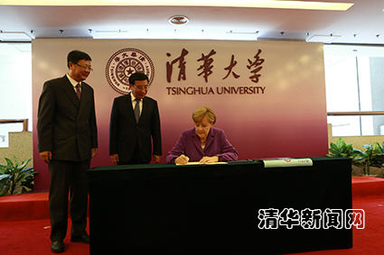 图为默克尔为清华留言。记者 智 斐 摄