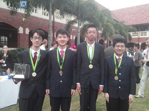 2013级新生出征澳大利亚参加国际信息学奥林匹克竞赛,包揽前三,创造史上最好成绩,图中从左到右依次为陈立杰、乔明达、王康宁、许昊然。