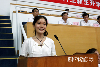 人文学院朱林青作为新生代表在典礼上发言,她说,清华给我们带来的,不是金灿灿的光环,而是沉甸甸的使命。成为这个园子的新主人,我们尽可以在这片沃土上砥砺青春,追逐梦想。以四载韶华,投入最朴素的奋斗,以青春活力,坚守百年清华的誓言,让精彩的人生从清华开启。