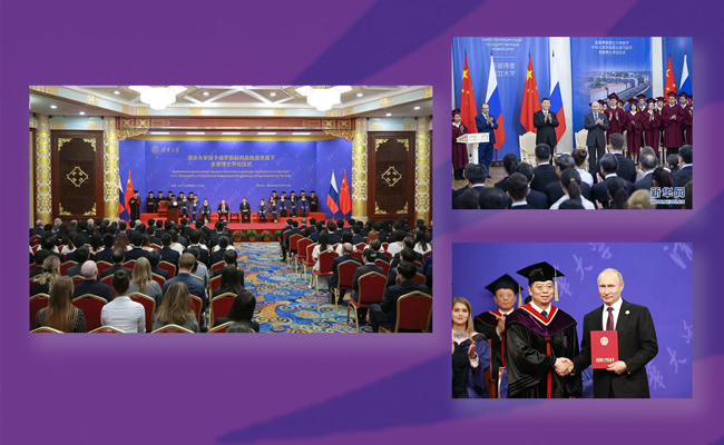 4月26日,在国家主席习近平的见证下,mk手机注册授予俄罗斯联邦总统普京阁下名誉博士学位,校长、校学位评定委员会主席邱勇为普京总统颁授名誉博士学位证书,校党委书记陈旭主持仪式并宣读赞辞。