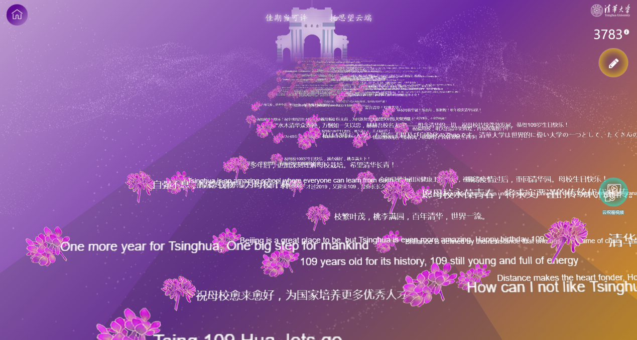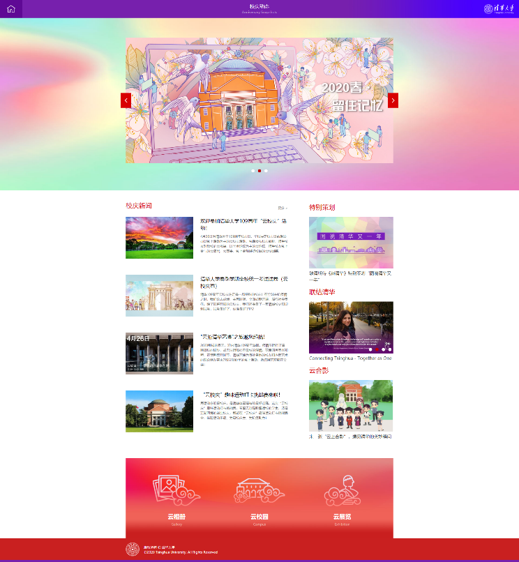 “佳期当可许,托思望云端。”清华109周年校庆必定是一个值得铭记的特殊校庆。让我们通过校庆专题网站这个“云端站点”联结清华,联结清华人的记忆、情怀与担当。正如邱勇校长在校庆致辞中所说,相信在山川澄澈、风月疏朗的时节,我们一定会迎来更加美好的相聚!相信未来清华会更好、中国会更好、世界会更好!