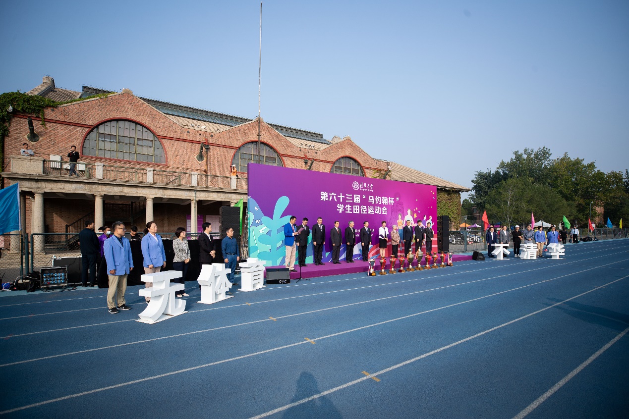 闭幕式开始前,校领导邱勇、陈旭、吉俊民、杨斌、尤政、过勇、郑力、向波涛身着白色运动服,在刚刚结束比赛的跑道上列队待发。自2016年以来,每年“马杯”闭幕式都以校领导带队绕场一周的方式入场,传递体育育人的清华传统。