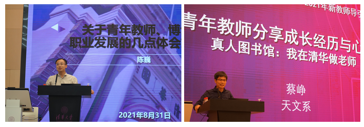 在“真人图书馆”环节,电子工程系教授陈巍、天文系副教授蔡峥结合自身在清华工作的经历,向全体新教师分享了自己进入清华以来从事的科研、教学和公共服务工作。陈巍表示,青年教师需要平衡好教学、科研和管理三者之间的时间,要让教学、科研和管理发生“化学反应”,努力实现“成就自我,点亮学生,带动学科”的目标。蔡峥说,成为教师意味着“有一分光、发一份热;有一口气,点一盏灯”,教师要以顶天、立地、树人为目标,为学生做榜样,为国家育人才。