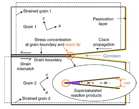 图3.应力腐蚀引起的沿晶断裂和抑制机理示意图