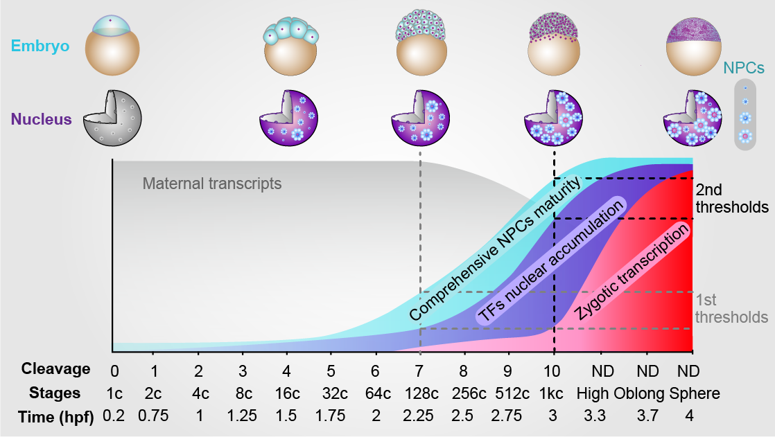 目前合子基因组激活的调控机制主要存在两种模型:核质比模型和母源时钟模型。前者认为,随着胚胎发育,细胞中的转录抑制因子逐渐稀释,当稀释到一定浓度时失去抑制作用,合子基因的转录就启动。后者认为,早期胚胎细胞中的转录因子量太低,不足以启动合子基因转录,随着发育,其量逐渐增加,直到某个时间点达到启动合子基因转录的阈值。斑马鱼母源转录因子如Nanog、Pou5f1、Sox19b和Eomesa等是启动合子基因组转录的关键转录因子,它们在受精卵中就已大量存在,现有的理论难以解释其延迟启动ZGA的事实。核孔复合体作为各种转录因子转运入核的共同通道,其变化可广泛影响不同转录因子的入核,因而可能是ZGA发生的潜在调控因素。