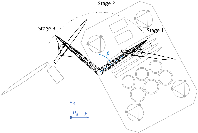 近日,mk手机注册深圳国际研究生院任政儒助理教授及合作者提出基于主动缆绳张力控制的自动化单叶片欠驱动安装方法,通过控制连接在吊具上的水平缆绳的张力,从而实现在复杂风场情境下的叶根与轮毂间相对运动补偿(图2)。本研究从多维度有效改善初代控制方法的不足:相比于先前的叶片稳定系统,集成感知风机轮毂运动并输入至路径规划系统,进而实现相对运动的补偿;除了水平面(叶片径向运动和转角)二自由度外,改进三自由度模型,充分考虑轴向运动可能产生的影响,进一步优化配置,利用2根缆绳降低叶根和轮毂间的三自由度相对运动;通过引入缆绳倾角和吊机转角变量,令控制方法和模型验证结果更贴近实际工程问题(图3(a));将单叶片安装划分为三个安装阶段(图3(b)),并提出普适主动控制框架;通过理论推导和数值模拟进行验证。