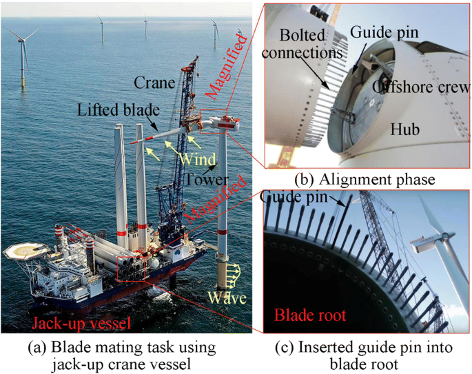 图1.单叶片安装过程 (a)叶片和轮毂对接,(b)高精度对接作业,(c)叶片定位销