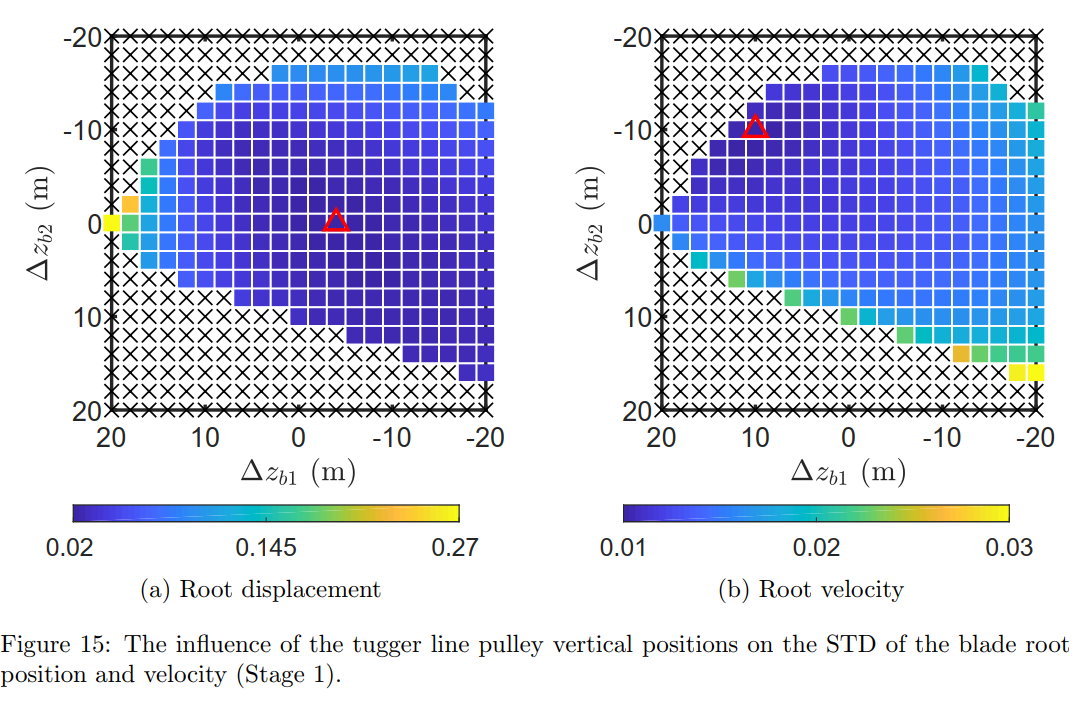 研究人员提出水平缆绳倾角的表征形式,改进吊机-单叶片安装的三自由度欠驱控制模型。采用模块反推方法设计控制器,并利用李雅普诺夫方法进行理论证明。通过独立开发的水动-气动-多体高精度仿真工具验证控制方法的可靠性。此外,研究结合敏感性分析确定缆绳倾角对于控制效果的影响,并给出适用建议(图4,图5)。
