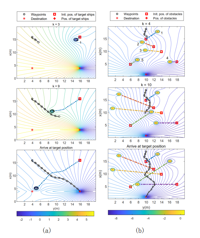 图3. 路径规划仿真验证:(a)满足《国际海上避碰规则公约》的避障,(b)多运动障碍物的复杂场景避障