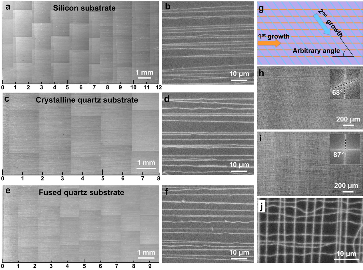 得益于基底拦截导向策略的理性设计和工艺条件的优化,超长碳纳米管的阵列密度首次提升至约6700根/mm,比传统方法至少提升2-3个数量级(图2),且制备的超长碳纳米管还具有分米级的长度、较少的管壁数、近乎完美的结构和较高的半导体型纯度。基底拦截导向策略在硅片、石英、石英玻璃等基底上也表现出良好的普适性(图3),并可用于制备规整的超长碳纳米管交错网络,为构建纳米电子器件提供材料基础。
